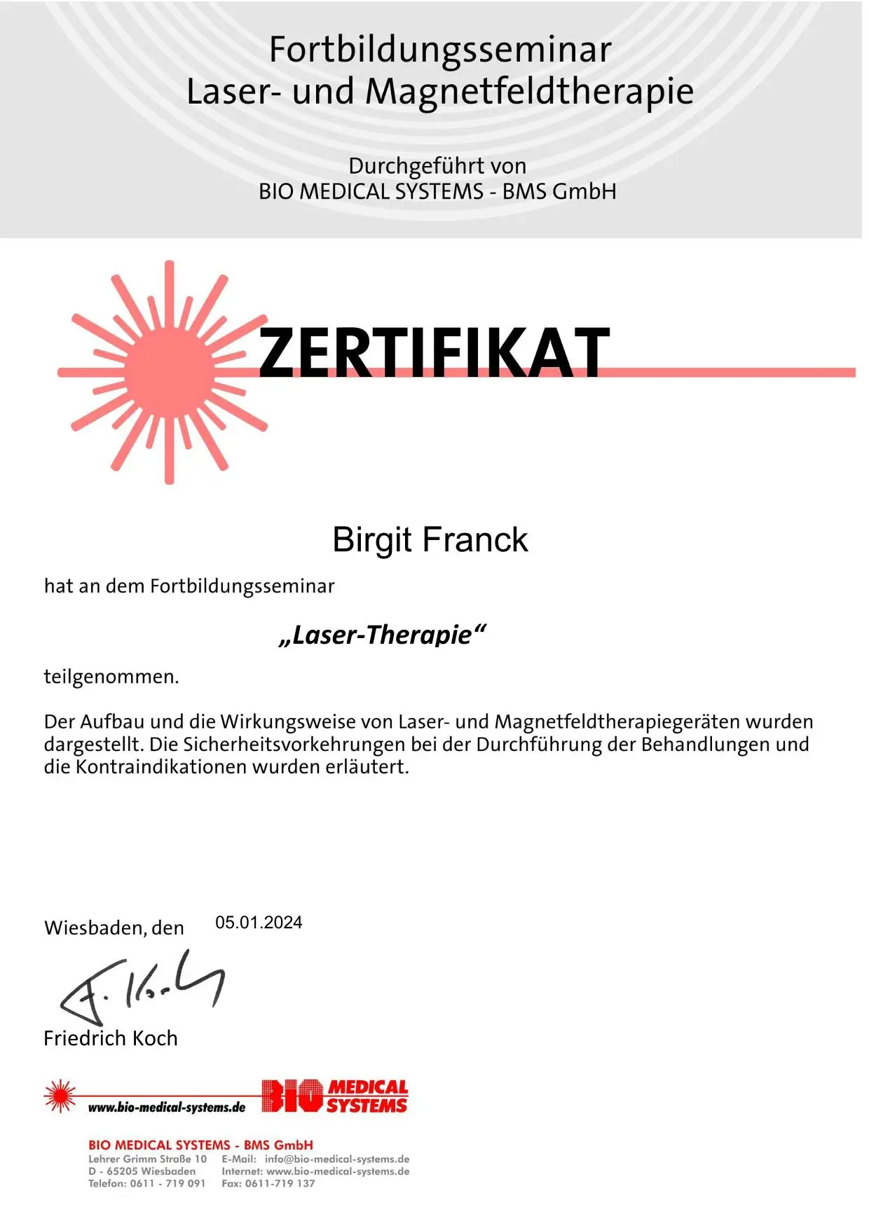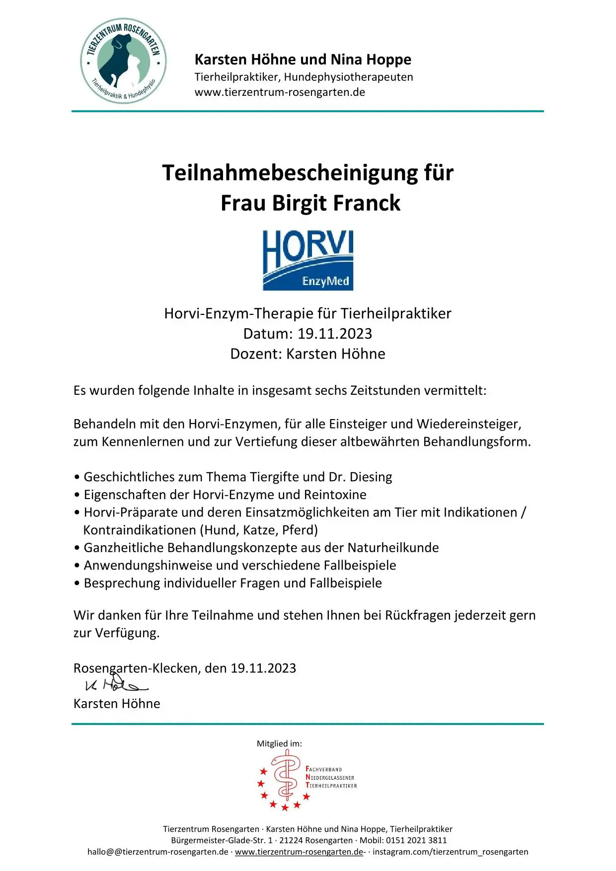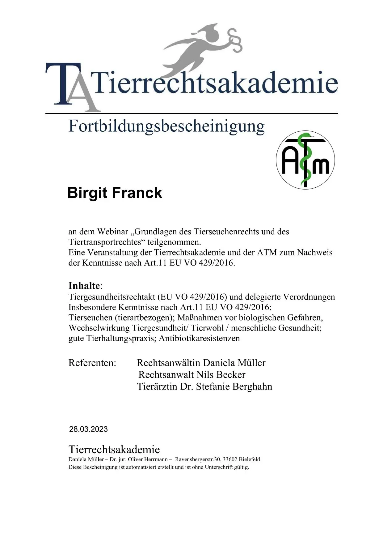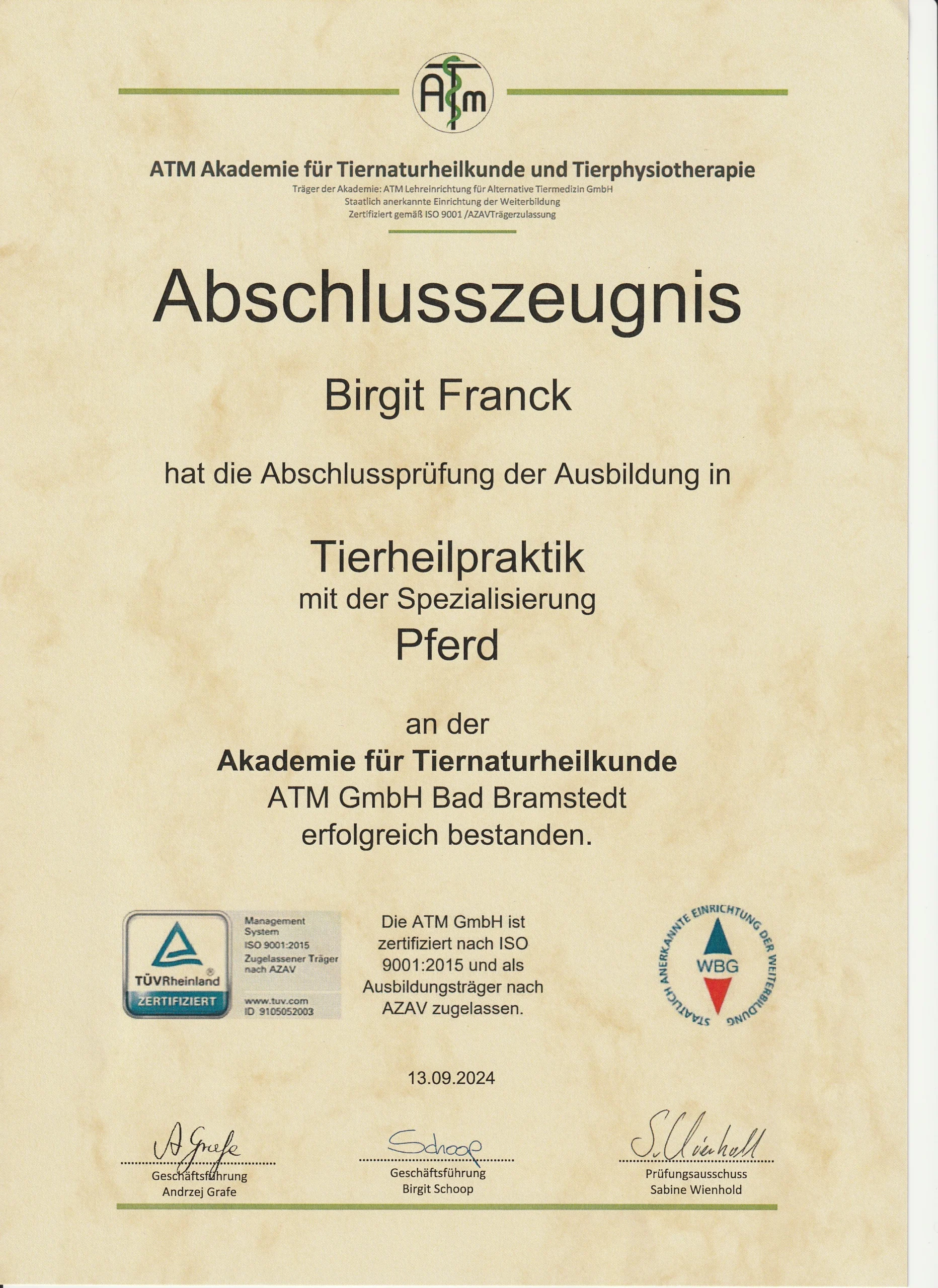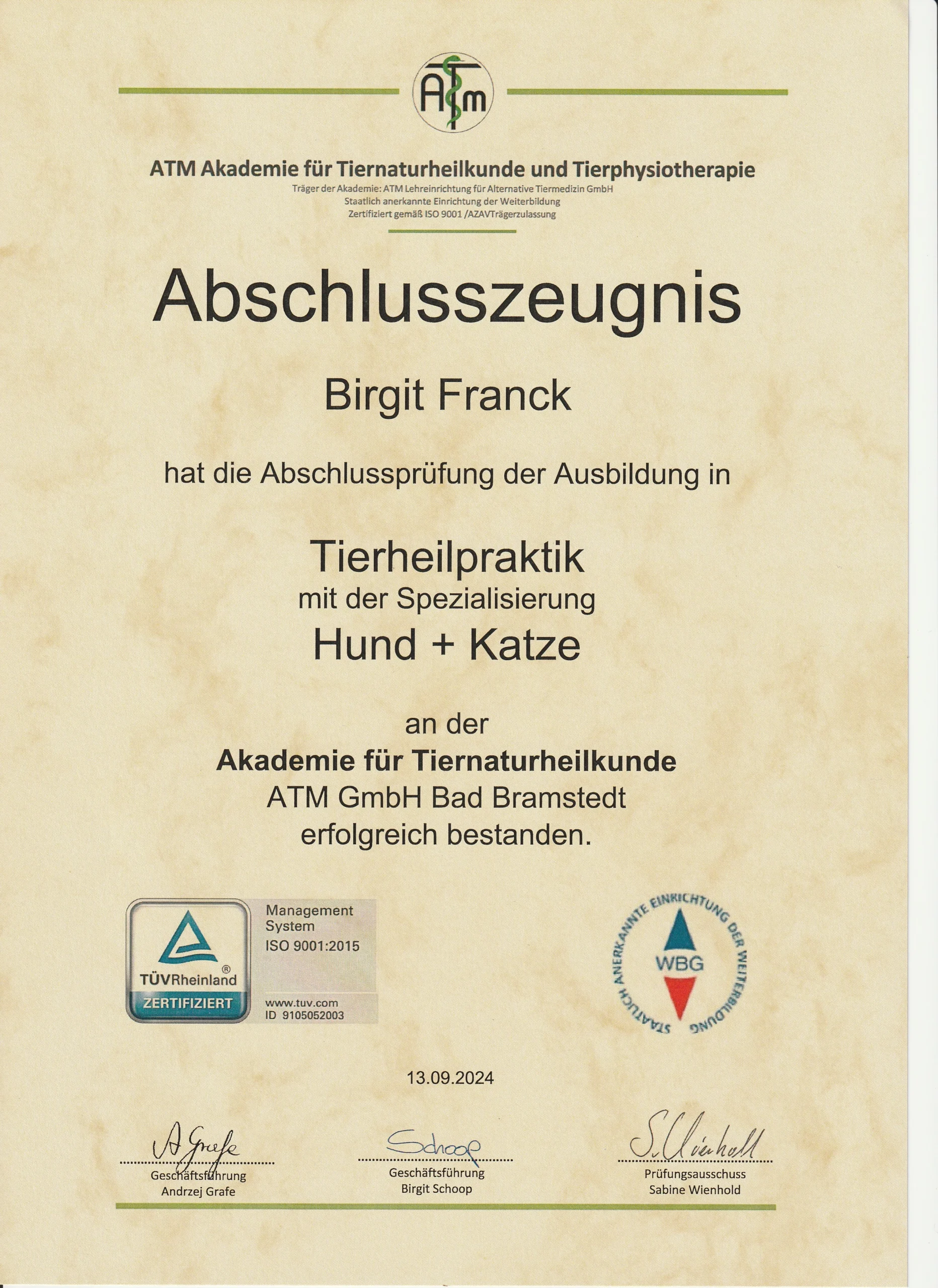 - Ausbildung zur Tierheilpraktikerin bei der ATM (Akademie für Tiernaturheilkunde), Bad Bramstedt